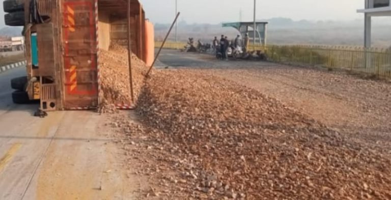 अनियंत्रित ट्रेलर डिवाइडर पार कर हाईवे पर पलटा, लगा जाम
